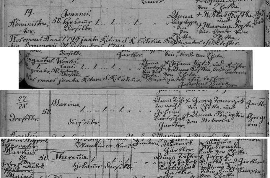 Děkuji. S tím číslem popisným jste mi otevřel nové obzory Asi to byl drsný kraj - té ženě se již 6 let před tím narodil další nemanželský syn ... A na téže čísle popisném bydlí i nějaká další rodina, jejíž jméno se mi nedaří rozluštit: Martin Babinak/Gabinak ... ale určitě to není Bartošák, že (viz kniha sňatků)? Pak už dám snad pokoj - musím se sama naučit číst je to nesmírně zajímavé.