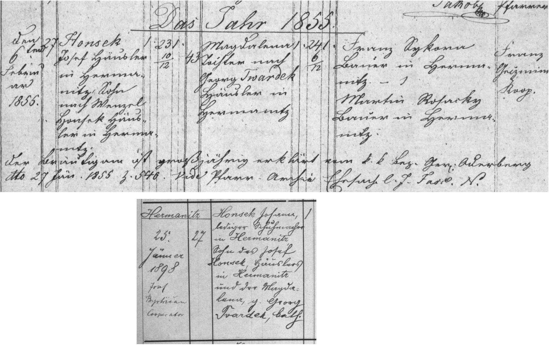1) 6. února 1855 v Heřmanicích - ženich z čp. 27 Josef Honsek (svobodný, katolík, 23 let, 10 měsíců), domkář v Hežmanicích, syn (zemř.) Václava Honseka domkáře v Heřmanicích... nevěsta z čp. 43 Magdalena (svobodná, katolička, 24 let, 6 měsíců) dcera (zemř.) Jiřího Twardeka domkáře v Heřmanicích... svědkové František Sýkora a Martin Rosacky? oba zemědělci z Heřmanic... ženich byl zplnoletněn 27. ledna 1855...