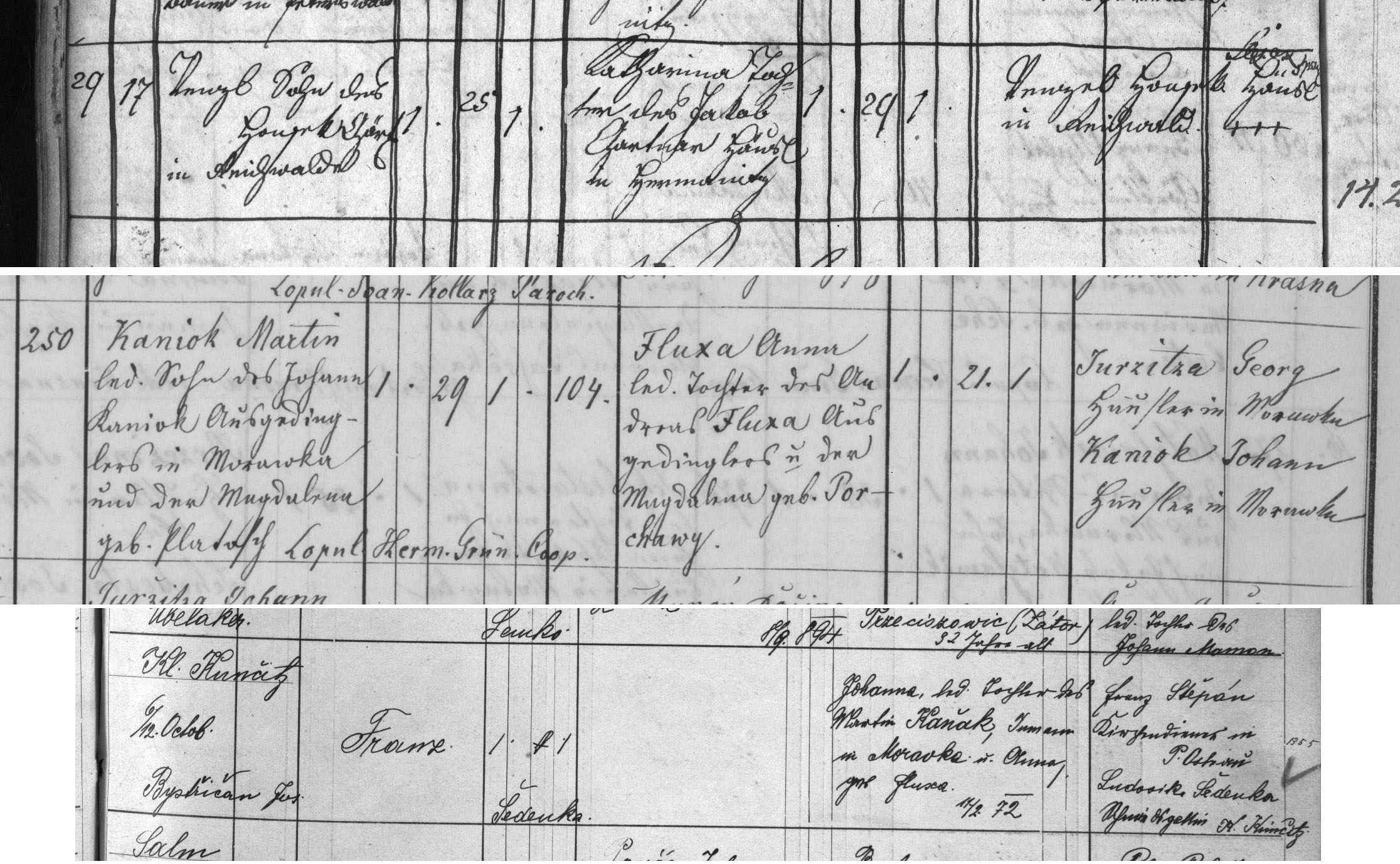 1/ ženich Václav Honzek, nerozluštím obec, je ještě jednou uvedena vpravo na konci údajů. Pohybuji se na Slezské Ostravě, je možné, že bude z okolí. Nevěsta je Kateřina, dcera Jakuba Guttnara z Heřmanic.